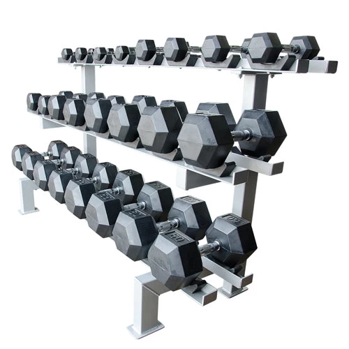 These adjustable dumbbell racks will accommodate an inside handle length between 4-1/2″ and 5-3/8″. Each level is adjustable and is furnished with high-impact polyethylene cradles. 2″ x 3″ 11 gauge steel construction with durable, black powder coat finish. Dumbbells not included.