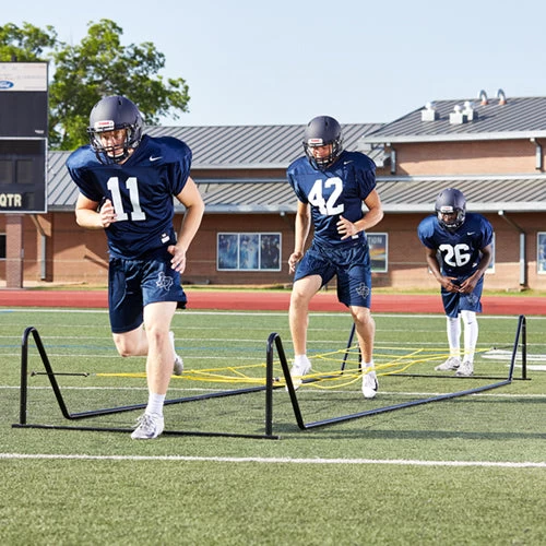 Extremely durable and designed with safety in mind, this unit is perfect for training athletes of all sports. Features an optic yellow step grid (adjusts from 5″ to 17″ height) and an exclusive frame design to keep all tubing safely away from the training path. Frame constructed with powder-coated 17 gauge tubing. No tools required. Grid is 14′ 10″ X 3′ 3″. Frame dimensions – 18.5’ L x 4.5’W grid adjusts from 6″ to 15″H.