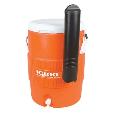 - What’s a favorite way for a team to celebrate a win? Dump water over the coach’s head of course! The Igloo® 5 Gallon Water Cooler is the right size for this joyous task. Durable Igloo 400 Series Industrial Strength Water Coolers keep water cold, clean and available — your athletes will stay hydrated with this Cooler. FDA approved white inner liner is easy to clean and resists stains and odors; Ultratherm® insulation keeps water ice cold. In recognizable yellow and red for easy visibility and safety. UV protection prevents surface from chipping, peeling or rusting. Lid is attached by a cord to prevent loss. Reinforced handles. It’s a must-have fixture on the sidelines of any game or practice. It’s a welcome site for your players during practice or a game: the classic Igloo 5 Gallon Water Cooler.