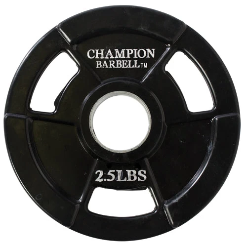 The Champion Barbell rubber-encased weight plates will not crack, chip, flake, peel, rust or tear like painted cast iron or other non-rubber plates. Prevents damage to floors, upholstery and will not dent or scratch expensive equipment. Reduces noise. Never needs painting. Permanently molded rubber over cast iron.